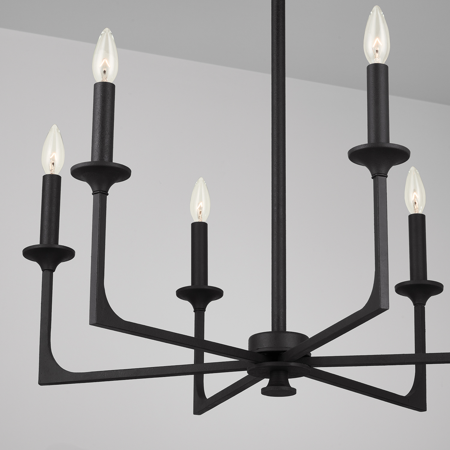 Understated lines in the Clint 6-Light Chandelier beautifully complement the bold prominence of the Black Iron finish. The unique corner details of this transitional design are reminiscent of turn of the century style.