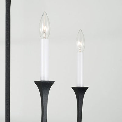 A timeless luminaire, the Decklan 4-Light Chandelier offers elegance with options. The textured Black Iron arms curve upward into flared bases for interchangeable candle sleeves – with both Matte White and Black Iron finishes included – to create tailored style in any space.